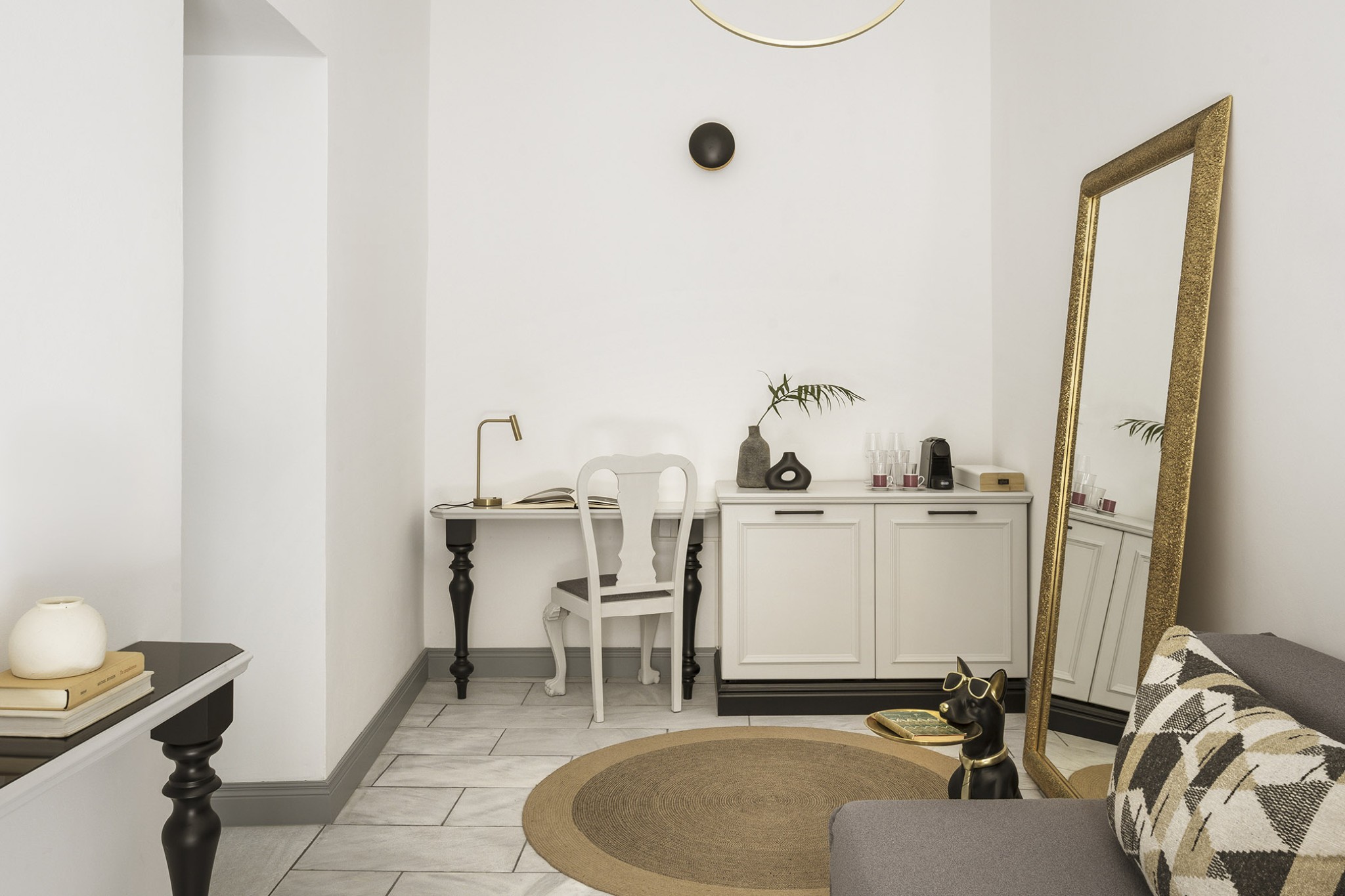 Tucked away on the quiet ground floor, this suite offers a serene sanctuary where timeless tradition blends effortlessly with understated luxury. Step inside and be transported to a simpler, more peaceful era. The tasteful design embraces classic elements, evoking the charm of bygone days, while offering all the comforts needed for a truly restful stay. Softly textured walls, adorned with artistic finishes, whisper stories of craftsmanship and care, adding warmth and quiet depth to the space.